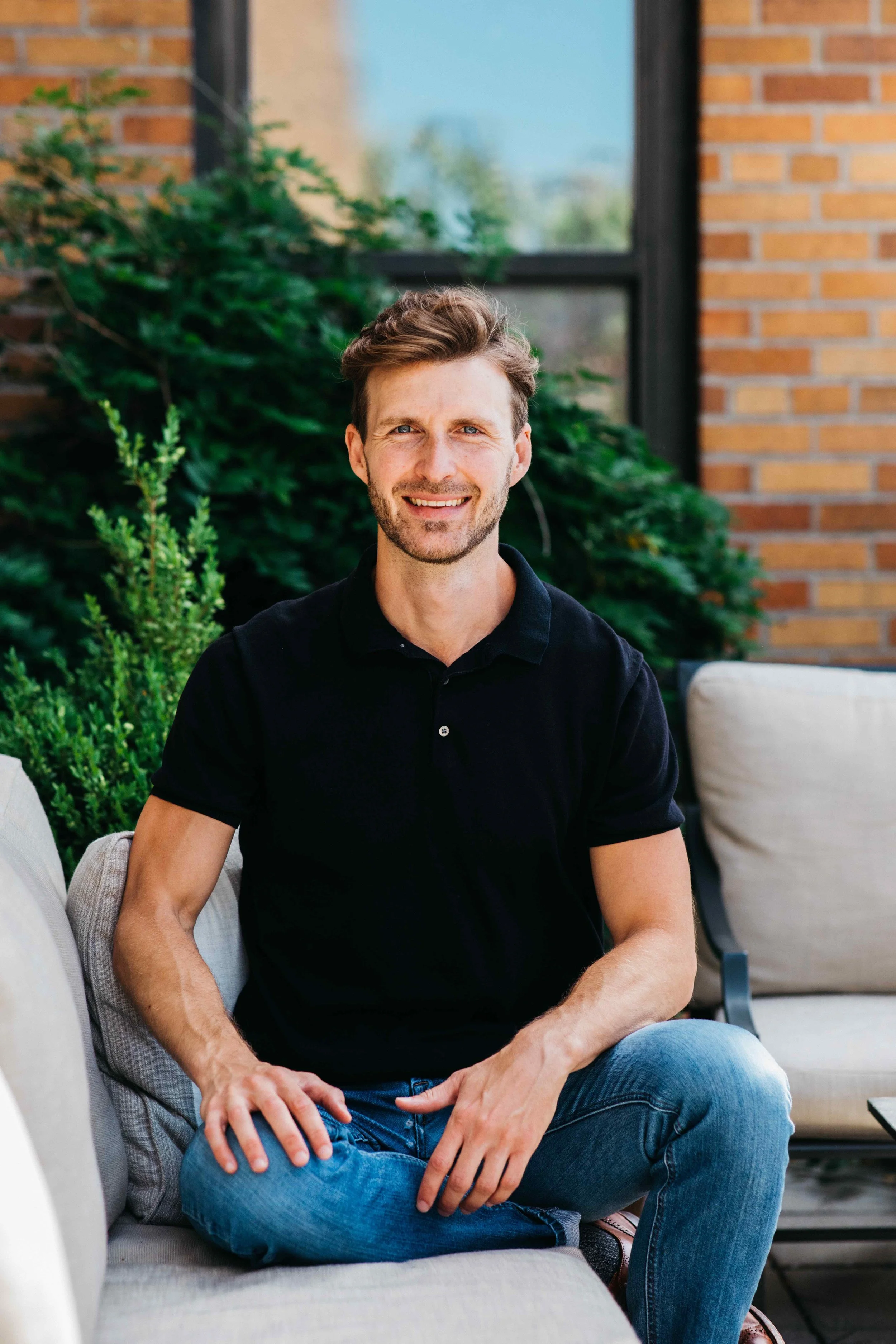 A smiling man with brown hair and blue eyes sitting on an outdoor patio with greenery and brick wall in the background.
